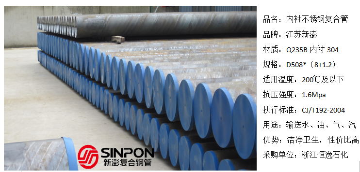 江蘇新澎復合材料有限公司,多年研發經驗,15項專利技術,多年來堅持務實發展,潛心鉆研,打造安全優質的內襯不銹鋼輸水管。