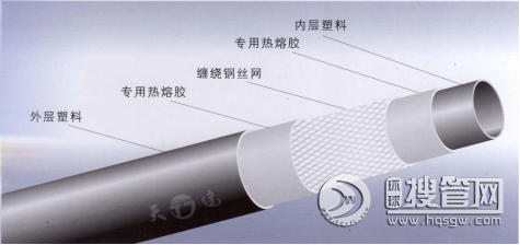 塑鋼絲和熱塑性塑料為原材料,以高強度過塑鋼絲纏繞形成的一層鋼絲纏繞網作為聚乙烯塑料管的骨架增強體,以高密度聚乙烯(HDPE)為基體,并用高性能粘接材料層將鋼絲骨架與內、外層高密度聚乙烯緊密地連接在一起,成功地解決了鋼--HDPE之間無連接因子的問題,使之具有優良的復合效果。