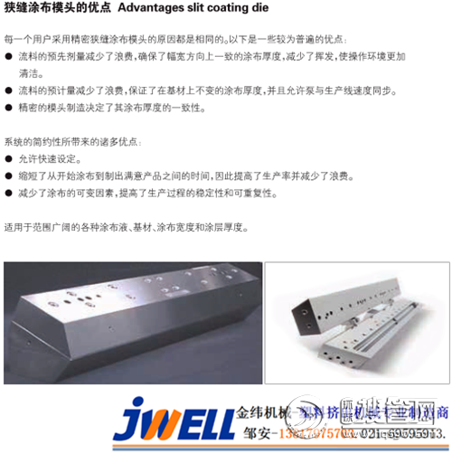在線涂布 用途:在線涂布不需要復(fù)卷且涂層薄而均勻;速度快、效率高、成本低;配套使用在片材生產(chǎn)線設(shè)備上窄縫涂布模頭可以生產(chǎn)出非常薄的涂層以及透明的光學(xué)涂層,同時可使涂層量保持在非常精確公差范圍內(nèi),與將涂布液擦拭到基材上的涂布系統(tǒng)不同,我們的窄縫涂布模頭屬于模唇縫隙相對較大(可達(dá)到 0.0762mm)的涂布模頭,由此模唇縫隙抽吸出的液體可形成最薄至 1μm 的涂層。窄縫涂布模頭可在涂層厚度只有 0.002mm 或者是 2μm 的情況下,將整個寬度上的涂層量控制在 5% 左右的公差變化范圍內(nèi)。我們生產(chǎn)的窄縫涂布模頭模唇是固定的,因此可以利用可換的控隙片來改變涂層的厚度和寬度。涂布量從不足1μm 到 254μm 的涂層厚度。該類模頭可加工各種類型的膠粘劑(包括特殊的透明膠粘劑)、電池、陶瓷電容器、裝飾表面、電子顯示介質(zhì)、過濾膜、地板、燃料電池、磁性泥漿、醫(yī)療產(chǎn)品、光阻材料、壓敏膠帶、太陽能電池、超導(dǎo)體、撕帶和窗用薄膜等。