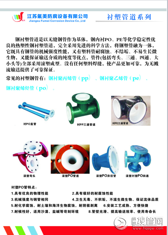 | 襯塑管道,管件內襯PE、PO,襯四氟乙烯管, 襯氟襯塑攪拌槳,四氟噴射泵,四氟波紋軟管,補償器,襯氟閥門等襯氟設備,四氟塔節,四氟通氯管,四氟儲罐,四氟反應釜等: |