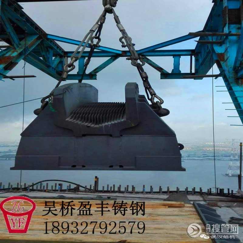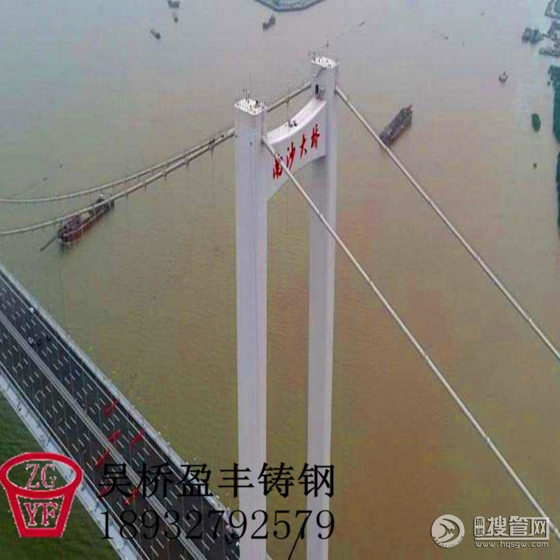 索鞍是支承主纜的重要構件,其作用是保證主纜索平順轉折;將主纜索中的拉力在索鞍處分解為垂直力和不平衡水平力,并均勻地傳至塔頂或錨碇的支架處。索鞍可分為塔頂索鞍和錨固索鞍。塔頂索鞍設置在橋塔頂部,將主纜索荷載傳至塔上;錨固索鞍(亦稱散索鞍),設置在錨碇的支架處,主要作用是改變主纜索的方向,把主纜索的鋼絲繩束在水平及豎直方向分散開來,并將其引入各自的錨固位置。為了減少塔頂索鞍處鋼絲的彎曲次應力,塔頂索鞍彎曲半徑一般為主纜索直徑的8—12倍;而散索鞍必須考慮鋼絲繩束的水平曲率半徑和豎直曲率半徑,以確定索鞍合理形狀。索鞍通常采用鑄焊組合件組成,大型組件采用分塊制作,安裝后通過螺栓或焊接連成整體。