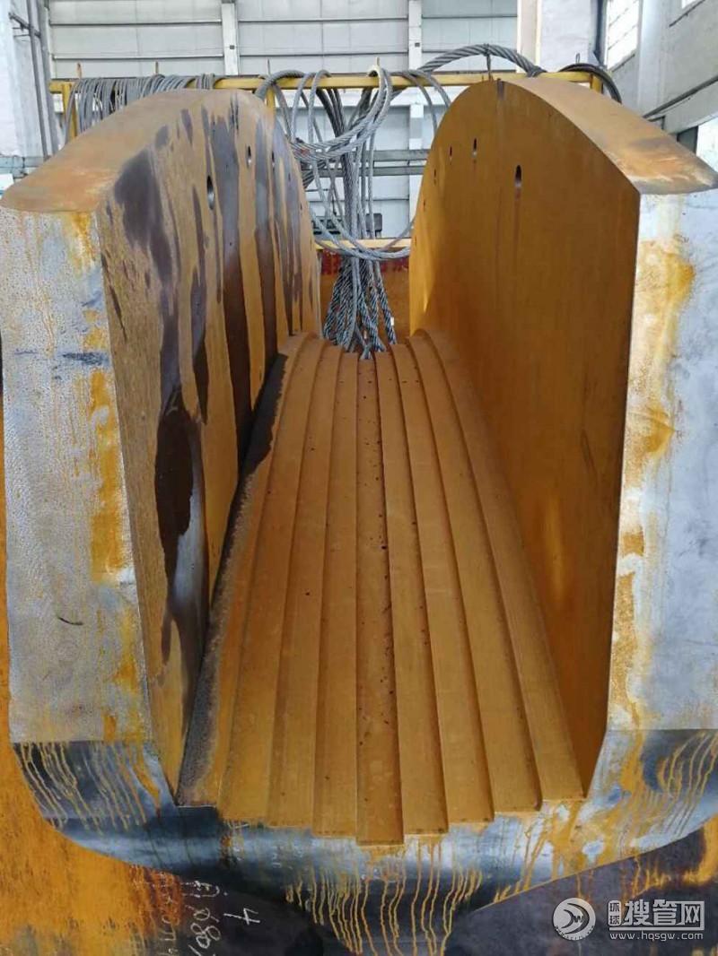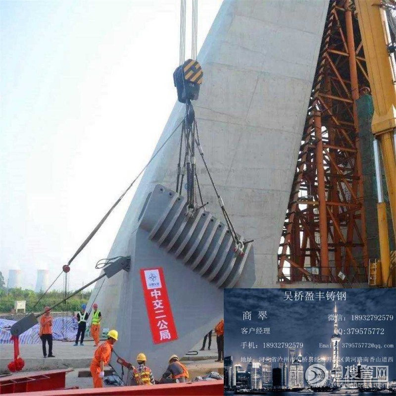 索鞍是支承主纜的重要構件,其作用是保證主纜索平順轉折;將主纜索中的拉力在索鞍處分解為垂直力和不平衡水平力,并均勻地傳至塔頂或錨碇的支架處。索鞍可分為塔頂索鞍和錨固索鞍。塔頂索鞍設置在橋塔頂部,將主纜索荷載傳至塔上;錨固索鞍(亦稱散索鞍),設置在錨碇的支架處,主要作用是改變主纜索的方向,把主纜索的鋼絲繩束在水平及豎直方向分散開來,并將其引入各自的錨固位置。為了減少塔頂索鞍處鋼絲的彎曲次應力,塔頂索鞍彎曲半徑一般為主纜索直徑的8—12倍;而散索鞍必須考慮鋼絲繩束的水平曲率半徑和豎直曲率半徑,以確定索鞍合理形狀。索鞍通常采用鑄焊組合件組成,大型組件采用分塊制作,安裝后通過螺栓或焊接連成整體。