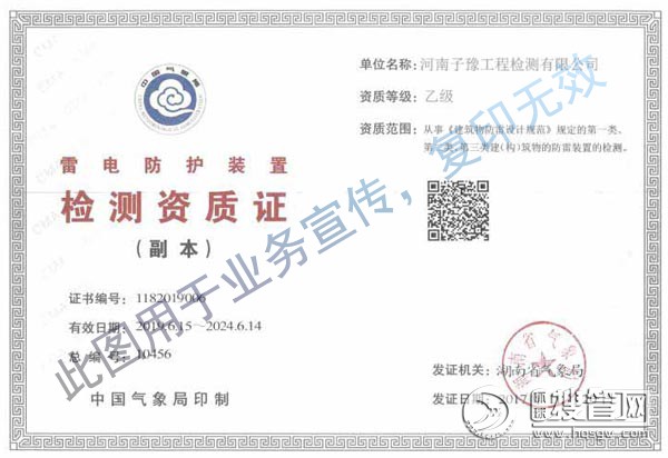 河南子豫工程檢測(cè)公司成立于2018年,取得了由河南省氣象局頒發(fā)的防雷檢測(cè)資質(zhì)證書(shū),經(jīng)質(zhì)量技術(shù)監(jiān)督局授權(quán)CMA計(jì)量認(rèn)證,具有向社會(huì)出具證明作用的數(shù)據(jù)和結(jié)果的第三方檢測(cè)機(jī)構(gòu)。乙級(jí)防雷檢測(cè)公司